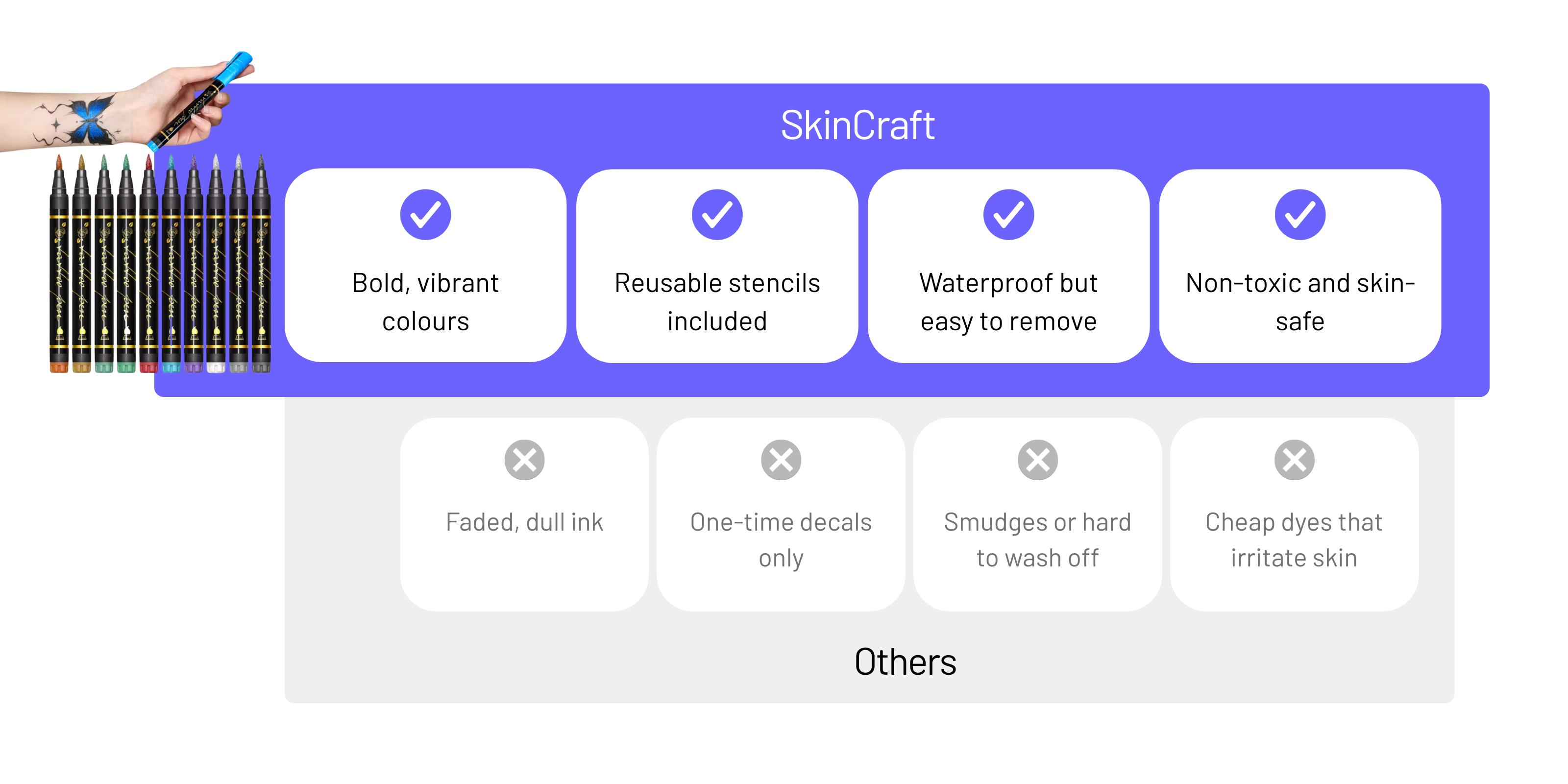 Each pen is packed with bold, eye-catching pigment that shows up beautifully on skin. Whether you’re using the stencils or free-hand drawing, your designs will stand out with bright, lasting colour.